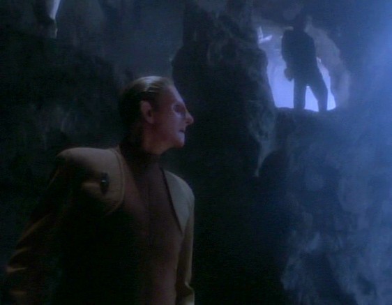 Odo meets his contact in a cave on a barren moon. Odo's contact, staying in the shadows without letting Odo see him, confirms that the Romulans have something to do with the attempt on Garak's life. But the attack on Garak is merely a small piece of a much larger puzzle. Cloaked Romulan warbirds have been detected near the Cardassian border, although it is unlikely they're planning to invade Cardassian space. Also, the contact tells Odo that five other Obsidian Order operatives were also killed the day before, three from "natural causes" and two had unfortunate "accidents".