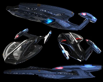 The production CGI model was built at visual effects (VFX) company Double Negative (DNeg) by VFX artist Brian Tatosky, who had confirmed Eaves' indication of the model being a last minute addition by stating, "I worked for DNEG a VFX company during season one who built the Inquiry class and unfortunately during the time it was a late request that we didn't have time to properly finish out. [note: also explaining why there were no names and registries on any of the vessels in Riker's fleet] I would have made a lot more changes then, and now if I had the time and cash." Moving from DNeg to CBS Studios proper as VFX Supervisor following the first season of the show, he also added that a "(…)side goal of coming aboard Trek proper as a Supervisor from a vendor was to never "Zheng He" it ever again," concurrently explaining why he considered his build "(…)not my favorite ship by any means." [3] With his "Zheng He" remark Tatosky was apparently also siding with those fans who had frowned upon – to put it mildly – the use of only a single CGI model in the season one finale into one massive, what Ex Astris Scientia has dubbed the "copy & paste", fleet of Starfleet vessels, merely featuring the minutest of (warp nacelle only) detail changes. While considered by Ex Astris Scientia as "laziness in the one field of CGI where it is least acceptable!", [4] Tatosky had actually very little say in the matter given the scant time-span he was allotted by the franchise at the latest possible moment. Tatosky himself incidentally, would shortly thereafter move over to the Star Trek franchise proper as Associate VFX Supervisor.