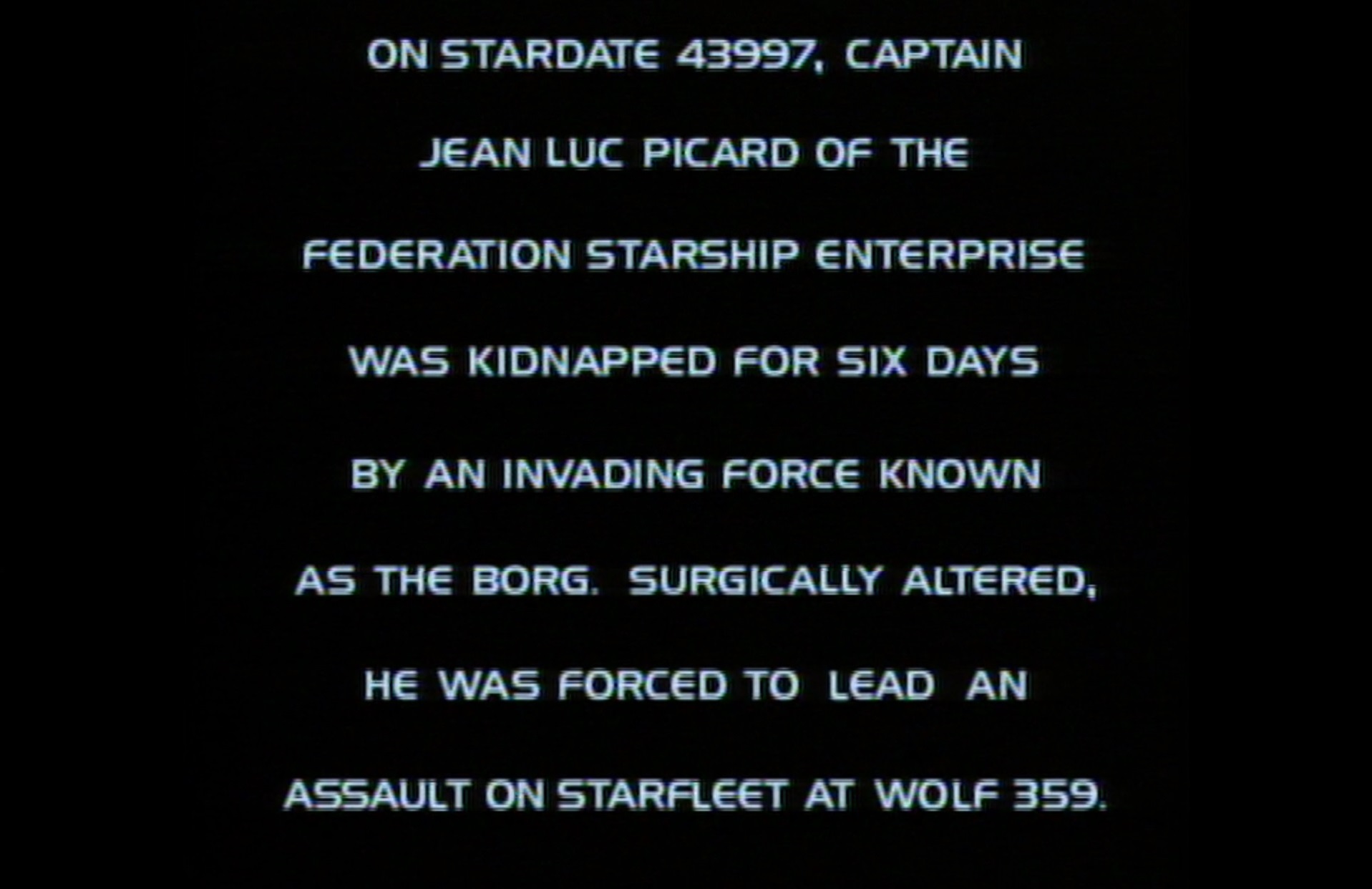 The opening crawl was a form of intertitle used to establish context for the opening scene of a film or episode. They figured prominently in both the Star Trek: Deep Space Nine premiere "Emissary", where it was introduced in the script simply as WHITE LETTERS ON BLACK: