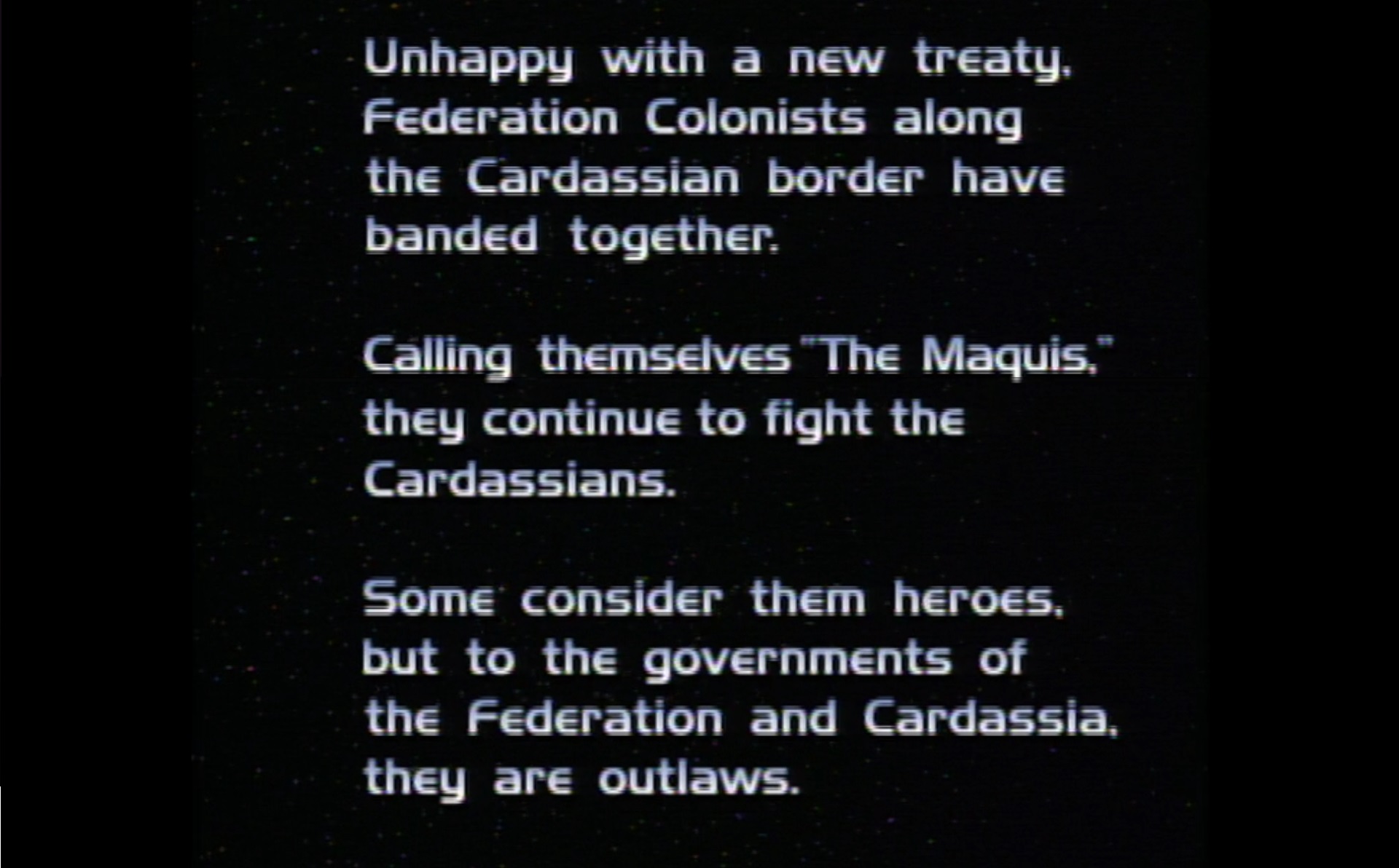 ...and the Star Trek: Voyager premiere "Caretaker", where it was introduced in the script as CRAWL TO BE SUPERED OVER BLACK: