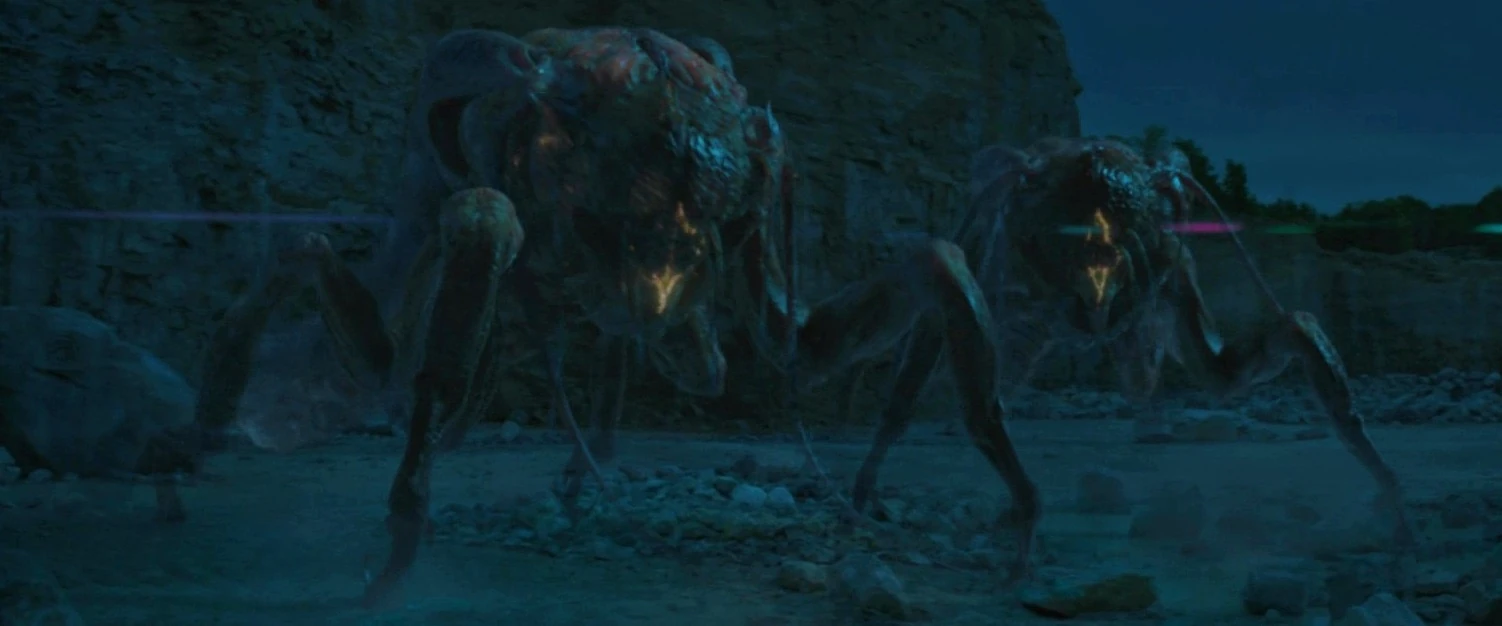 On Trill, Burnham rips the intonok barb out of Booker's leg while using a dermal regenerator to stop the bleeding. Booker then notices intonok eggs in a distant rock pile and the two realize the intonok have just been protecting their young. With no justification for antagonizing the creatures, the two prepare to beam out and return later for the clue. Minerals in the rockface interfere with transport, however. Burnham elects to show the intonok respect, stepping out from cover and dematerializing her phaser so as to not seem like a threat. This time Booker is successfully able to communicate that they are sorry and will be leaving the creatures' nesting grounds. The two intonok de-camouflage and allow Burnham and Booker to pass, though they still have to find a way to reach the clue.