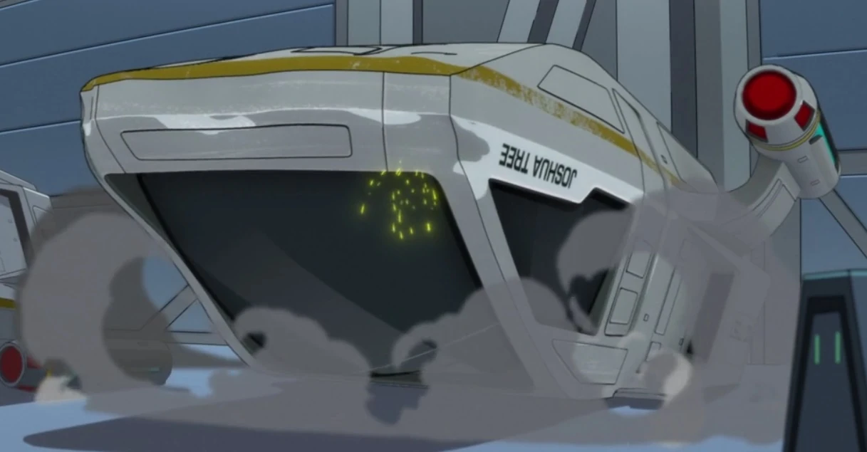 In 2381, the shuttle was used to depart the Cerritos by Mariner, Rutherford, Boimler, and Tendi. Mariner casually left the shuttle after setting its auto-navigation to return the Earth, as she claimed that she had to check the shuttle port nacelle, but was in reality staying aboard the Cerritos. In spite of Mariner's sabotage, Boimler was able to trick the auto-navigation into believing that the Cerritos was Earth and returned to the ship; however, because the shuttle was traveling with the intent of decelerating in Earth's atmosphere, it returned to the shuttlebay at an unsafe rate, and crash landed after it clipped the top of the bay, which ripping off the Joshua Tree's port nacelle, and caused it to rollover several times before landing on its roof. (LD: "Grounded")