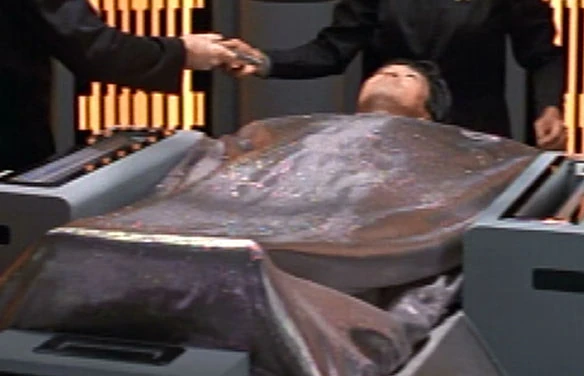 While docked at Deep Space 9, Nozawa was treated in sickbay where he was lying on a biobed while Tom Paris and Harry Kim reported to sickbay.