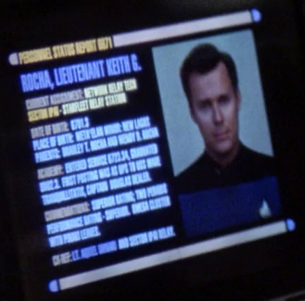 Lieutenant Keith G. Rocha, son of Bradley T. Rocha and Wendy D. Rocha, was a Starfleet officer who served until his death in 2369. He was born on stardate 6701.3 in New Lagos, Beta'Elan Minor. He entered Starfleet service on stardate 6723.34 and graduated on stardate 6802.3.