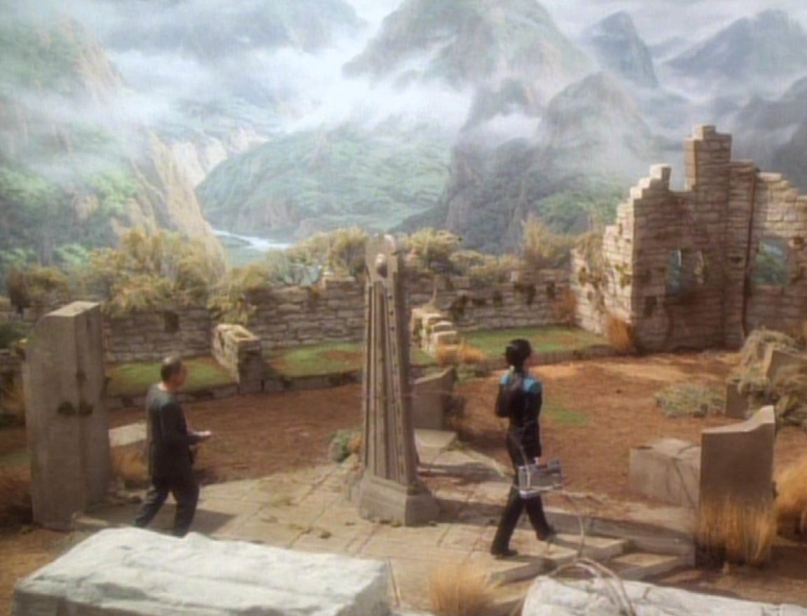 It is unclear whether the obelisk which, in "The Alternate", is found at the center of the ruins on L-S VI and described by Mora Pol as a possible "relic of Odo's people" was indeed genuine. "To tell you the truth," admitted Odo actor Rene Auberjonois, "I think the obelisk was simply a red herring. In fact, I asked [director] David Carson if anything is going to happen with this thing and he just grinned and said it's just a red herring to confuse the audience so they don't get too far ahead of us [....] But I never assume anything. Watch, three stories into next season there will be a whole story about the damned obelisk still floating around the station." (Cinefantastique, Vol. 25/26, No. 6/1, p. 103). The same obelisk-prop was used in DS9: "The Search, Part II" on the Founders' homeworld, but no connection about the similarity with the one from L-S VI was ever made on-screen.