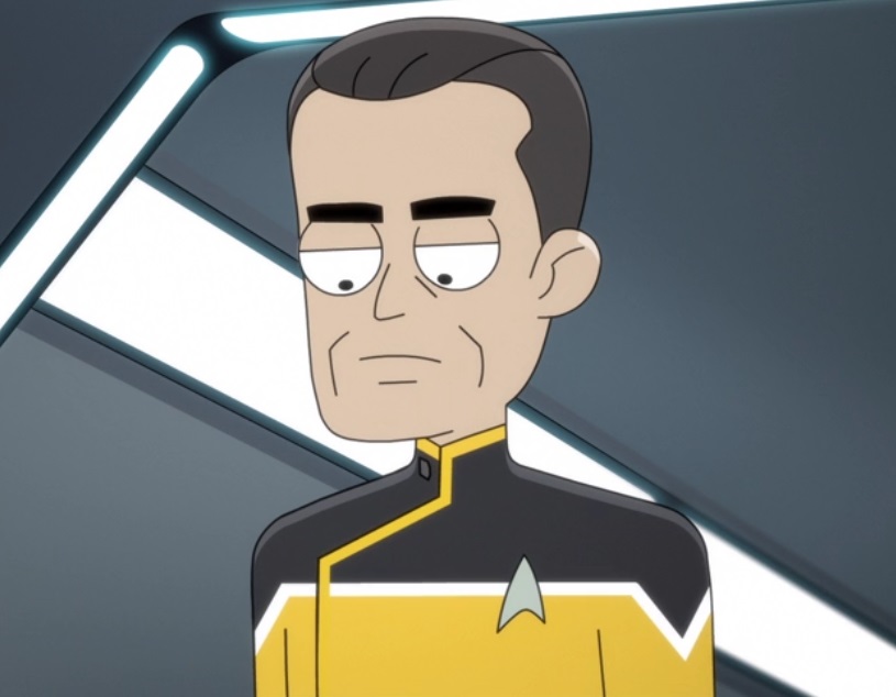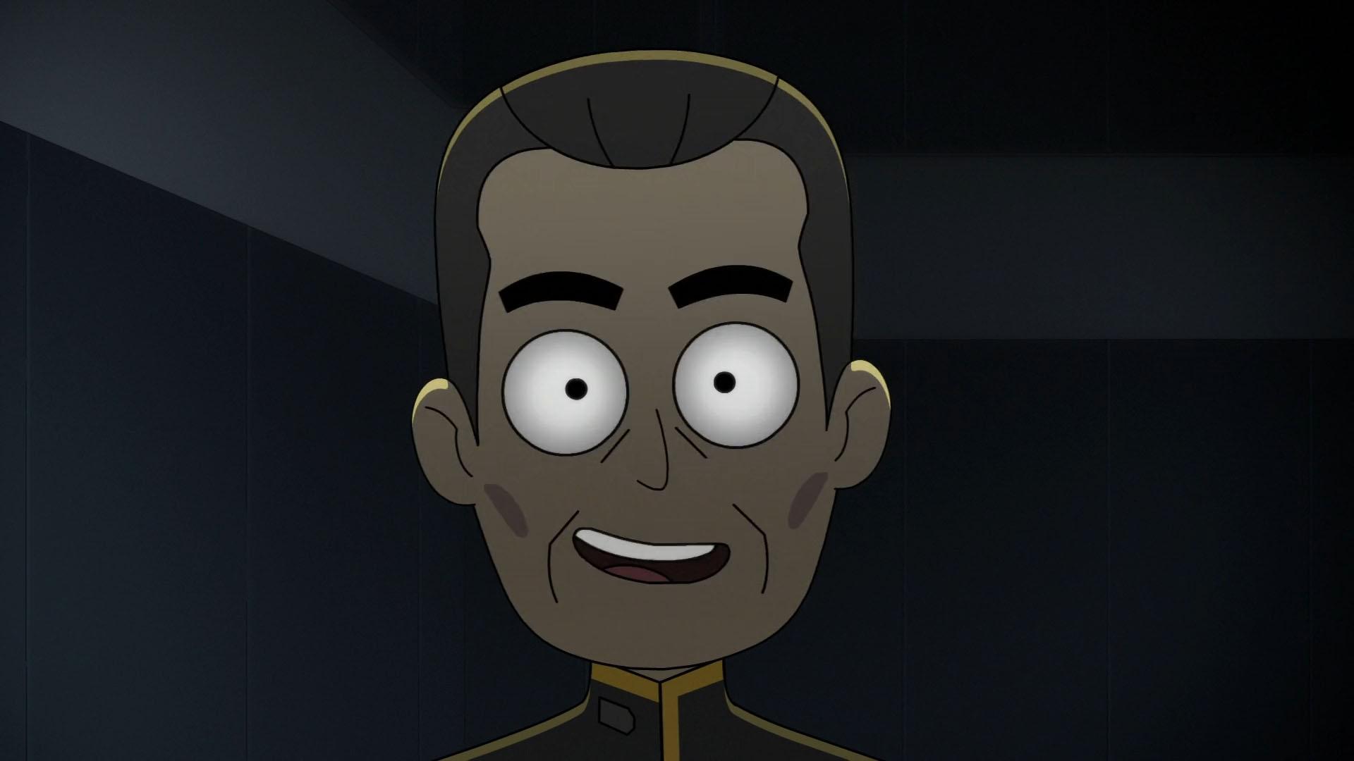 He encountered Vindicta after she boarded the Cerritos, leading the phaser against the intruder. Vindicta then told him to bring her "Free-man", and he said, "Never, witch!", before Vindicta flipped him and threw him against a bulkhead. Moments later, he called Tendi a "dirty Orion" before Vindicta disintegrated him with a shot from her phaser.