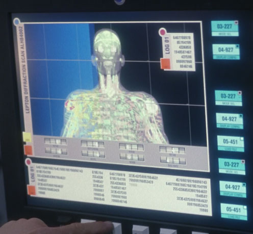 In 2153, a lepton diffraction scan was performed on a Borg drone inside the research module in the A-6 excavation team base camp. (ENT: "Regeneration")