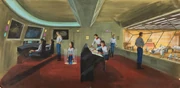 When Jefferies reported in for work on the first pilot, shortly after his interview with Roddenberry, he recalled, "When I started on Star Trek, Gene didn't even have an office, much less a secretary. Only Herb [Solow] was on the lot. But Gene came to the lot most days, and at first I dealt directly with him. Then the studio brought in a man by the name of Franz Bachelin, an old-time art director. They also brought in a friend of Desi [Arnaz], Art Director Pato Guzman from The Lucy Show. I was still a set designer, not an art director. I would have the bridge and the exterior of the ship to do and they were to do the rest." (Star Trek: The Original Series Sketchbook, p. 114) In the end, Jefferies spent full time the better part of two months designing the ship, or as he himself had put it years later, "about six weeks of frustration," during which he "spent a pretty good batch of Lucille Ball's money." [3](X) Both Art Directors Guzman and subsequently Bachelin, brought in after the former left, were Jefferies' superiors on "The Cage" at the time. Jefferies usually worked out his designs on paper with pencil and charcoal in black and white, but occasionally created full-color renderings, such as for the Enterprise – which actually sold Jefferies' final exterior design of the ship to the producers – and the bridge, in order to give the producers a more rounded feel for the intended design. However, after "The Cage" he all but dispensed with the full-color practice for the Original Series (though he did highlight a few of his later black-and-white sketches with additional colors).