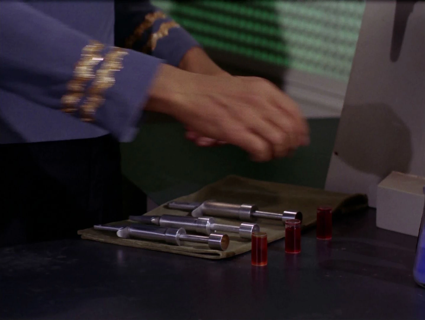 In 2268, Henoch (in Spock's body) volunteered to prepare the formula for the injection. Having done so, he enlisted Nurse Christine Chapel's aid in administering them to himself, and Thalassa (Mulhall), with a different formula for Sargon (Kirk). When Chapel objected, saying Kirk would die without the same formula, Henoch made her forget her objections. (TOS: "Return to Tomorrow")