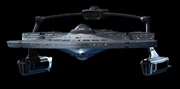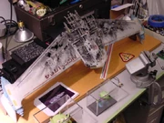 Another Miranda-class derivative model, Buckner built, and which did make it onto screen, was that of the USS Antares (NCC-9844). In the above mentioned private correspondence, Buckner further explained that it was a standard Reliant model kit with an AWACS pod made from the stand of an AMT Excelsior kit (No. 6630), and the nacelle coverings from the same kit used as torpedo launch tubes. It was actually filmed, unlike the Bradford, as a deep background ship element for use in scenes with Starbase 375 before the franchise went fully CGI. Because the scenes were just that, deep background ships circling the starbase, most of them being just standard Reliant and Excelsior kits, they did not require them to be kitbashed or battle-damaged like the ships in the opening of "A Time to Stand", and therefore needed only minimal detailing. For example, it did not have the elaborate lighting wiring that the Bradford was requested to have, the lighting as seen added in post-production, nor did it require a detailed paint job. This model was furthermore supposed to be a standard Miranda, enticing Buckner to decide of having some fun with it by adding the stand in lieu of the standard roll bar. The model, however, was filmed upside-down, so the alterations to the design were indiscernible on-screen, save for one establishing long-shot. [12] Like his other kitbash models, Buckner has retained ownership over this model as well.