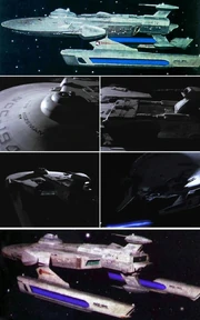 Three so-called break-away models of the class, cast from the molds taken off the studio model, representing the USS Saratoga, were built for the DS9 premiere "Emissary". (Movie Magic: "Models and Miniatures: A Model of Perfection") The Saratoga destruction sequence, along with the other Wolf 359 visual effects sequences, was one of the first scenes filmed for "Emissary", during pre-production on the pilot episode. The sequence was shot on a Paramount sound stage, rather than at Image G due to safety reasons over the use of explosives. Three takes were required to achieve the desired detonation - using all three breakaway models built for the sequence. (Movie Magic: "Space Effects: The Space Race")