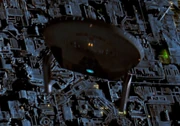 "It was the first time that anyone had actually assembled the entire Starfleet fleet in CG. Normally there were always a few ships they used for CG, and they pulled models out, and did motion control. Due to the nature of the show, there was no way they could do it with motion control. There was not enough time and not enough money. They were talking about having fifty to a hundred Starfleet vessels on screen at one time, and there was no way to pull that off in traditional ways. So we were a collecting point for anything that had been done in CG before. We brought the digital models in and converted them to LightWave 3D, which is our rendering package of choice. The Enterprise-D had been done before, but in something else, so we were able to bring the geometry in, and bring some of the maps in, but we had to rebuild it. We had all the ingredients, so we could put it together much more quickly than building it from scratch. So now we have folders with the entire fleet all lined up in the same form, so we can just load a Reliant, we can load a Defiant, we can load an Excelsior, whenever we need it. That was the first real challenge, to get all that stuff in order, and to fill the garage with useable ships." (Cinefantastique, Vol. 30, No. 9/10, p. 64)