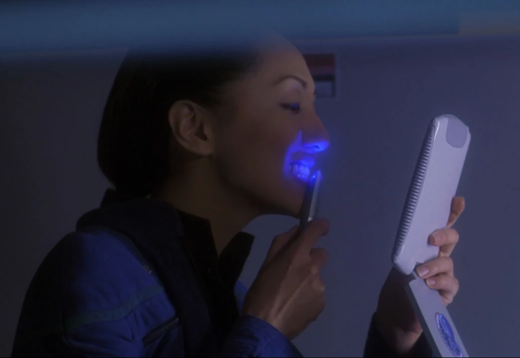 In September 2152, Ensign Hoshi Sato used a hand-held magnetic mirror while cleaning her teeth with a sonic toothbrush. (ENT: "The Catwalk")