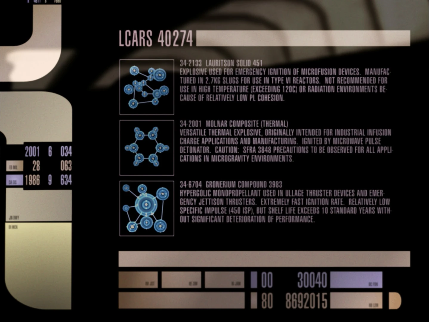 In that year, Molnar composite (thermal) was on a list of explosives that Lieutenant Commander Data and Counselor Deanna Troi searched through in an attempt to find one that could produce enough energy to release the Enterprise and an alien ship from the Tyken's Rift. (TNG: "Night Terrors", okudagram)