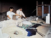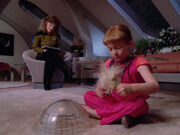 The graphic, Okuda referred to, was the LCARS silhouette display on the main viewscreen of the USS Enterprise-D, consulted by the bridge crew in the episode. The Mordan IV maquette was only the second such model used in the Star Trek: The Next Generation series, after the Farpoint Station landscape maquette, used in the pilot "Encounter at Farpoint", utilizing the same background painting that was used with the maquette in that episode. Superseded by matte paintings, it would remain so for years, until the season six episode "Birthright, Part I", for which a smaller maquette of a Romulan prison camp was created. (Star Trek: The Next Generation Companion, 3rd ed., p. 43) Due to the usually large size of maquettes, like that of Mordan IV, they were almost always scrapped after use, this one no exception. Yet on rare occasions, parts of them were re-utilized for use in another capacity. One of the transparent domes turned up as Alexandra's toy in Toya's quarters aboard the Enterprise-D in the later first season episode "When The Bough Breaks".