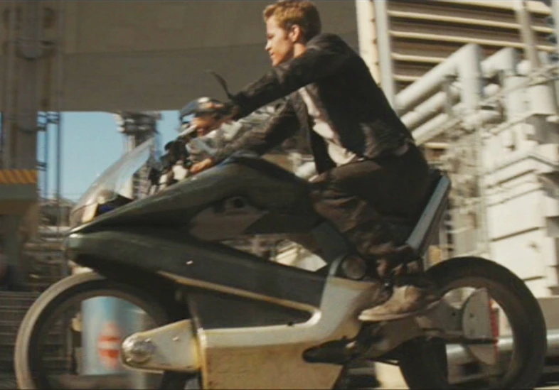 In 2255 of the alternate reality, James T. Kirk owned a wheeled motorcycle, just prior to his enlistment in Starfleet. Kirk's motorcycle's wheels, however, did not have spokes. When he arrived at Riverside Shipyard to board a shuttle to Starfleet Academy, a yard worker complimented Kirk on his vehicle. Kirk then casually tossed the startcard to the worker, telling him that the motorcycle was now his. Later in 2263, Kirk found a PX70 motorcycle aboard the USS Franklin on Altamid. Kirk and Jaylah then used it to distract Krall and his drones to free his crew. (Star Trek; Star Trek Beyond)