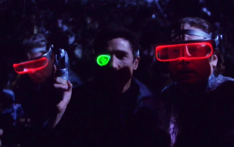 Lieutenant Malcolm Reed wears a nightvision eyepiece whereas two Eska with him wear imaging goggles