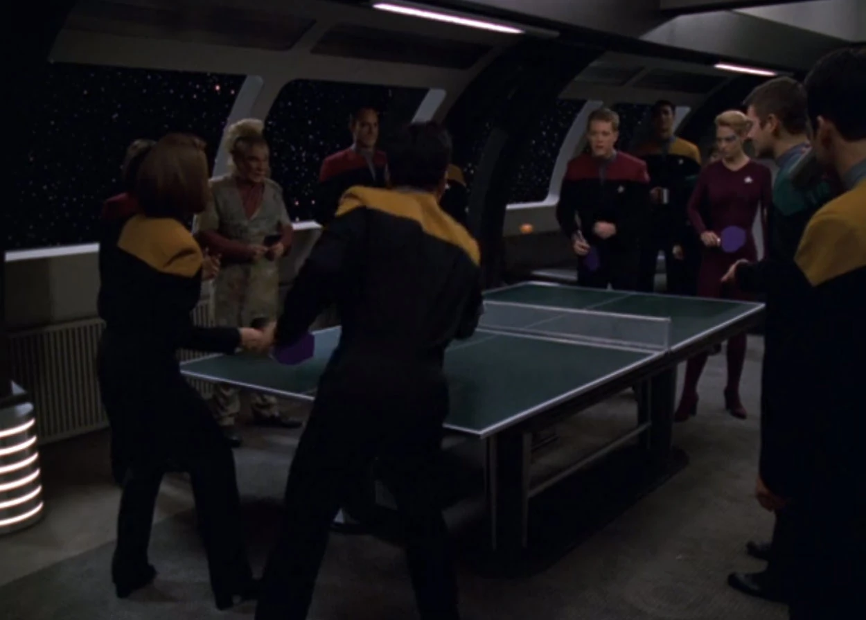 The USS Voyager held a ping pong tournament in 2375. Tom Paris invited Seven of Nine to be his doubles partner after William Chapman came down with an apparent case of space sickness. They played against B'Elanna Torres and Harry Kim.