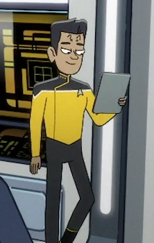 In 2381, he was on the bridge when the Cerritos fell victim to a scam that appeared as if they had accidentally destroyed the Ladyjane. (LD: "Mugato, Gumato")