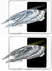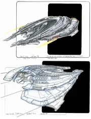 Multiple meetings concerning the design of the Son'a flagship were held. Eaves remembered, "They did all their meetings and plans with it flying the other way, so when I got into the detailed identification of the parts, they said, 'What's the bridge doing in the back?' They understood my point of view, but it was a pretty heavy discussion on which way it was going to fly, and I fought for it pointing the more aggressive way. If you don't know you couldn't tell, but I still feel that it's going backwards!" (Star Trek: The Magazine Volume 1, Issue 3, p. 21) The discussions to and fro took almost two months, and it was not until April that Eaves presented his final redrawn design sketches with the adjusted flight direction. Years later, Eaves conceded, "Overall it didn’t really make a big difference. That is being that that was over 10 years ago, so my sadness has faded." [3]