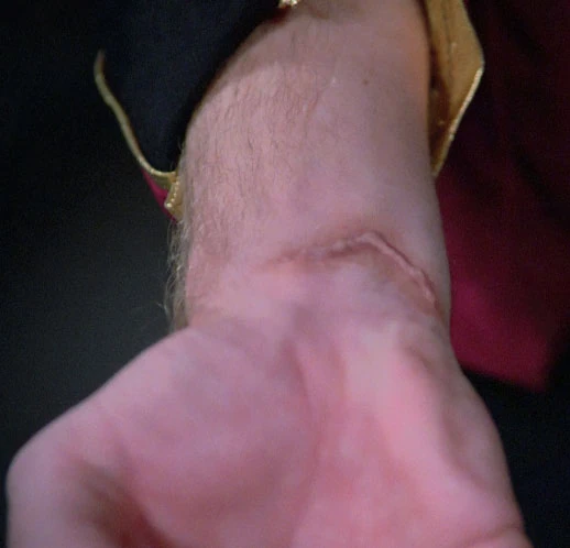 Admiral Mark Jameson revealed a scar on his right arm to Karnas in 2364 as a proof for his identity. (TNG: "Too Short A Season")