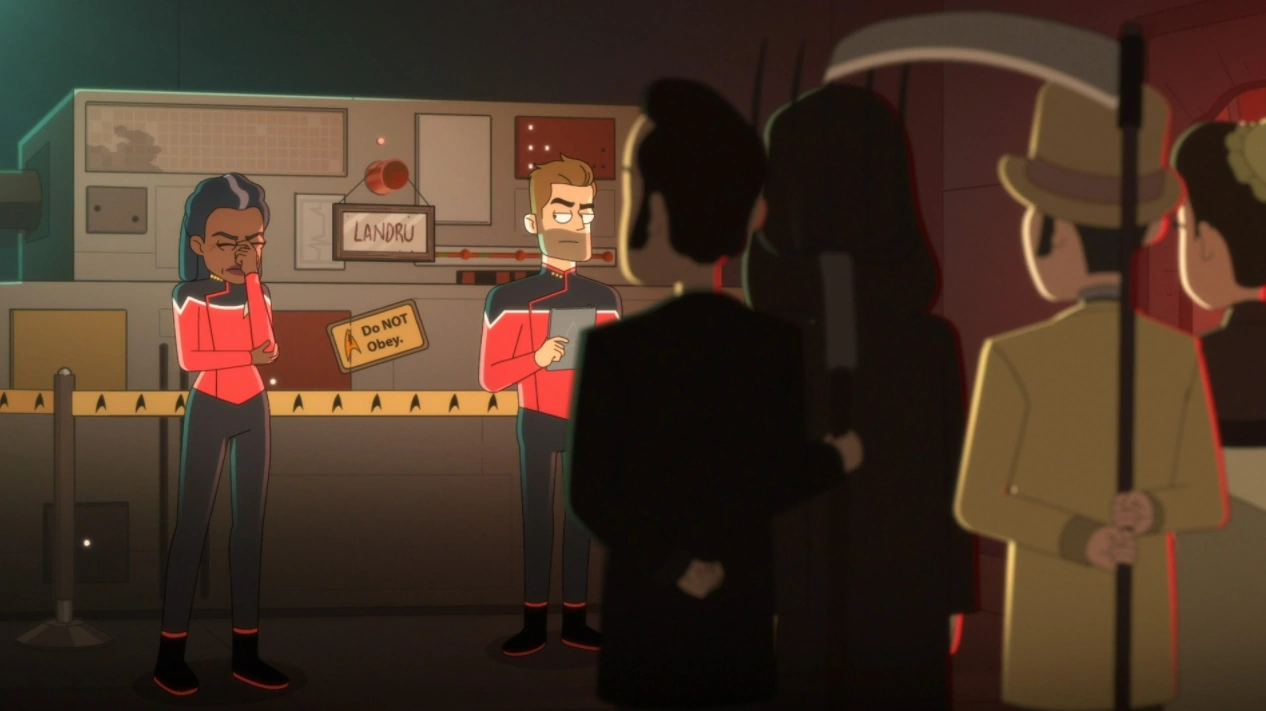 A Betan attempting to conceal his scythe from a Starfleet away team