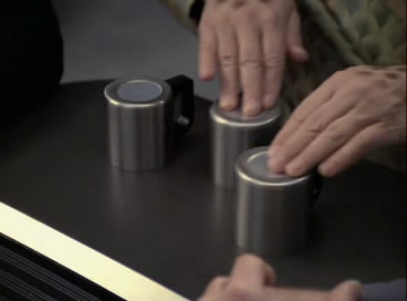 Neelix and Tom Paris unsuccessfully tried this scam on The Doctor, in an attempt to prove their deceptive instincts had not dulled with time, after they were conned by Dala and Mobar. Later, however, after Dala and the others were successfully defeated, they again ran the shell game, this time tricking The Doctor with a technique known as "the old handoff," in which Neelix passed the tera nut used in the game to Paris without The Doctor noticing. Although The Doctor considered this "cheating", Neelix commented "We've still got it." (VOY: "Live Fast and Prosper")