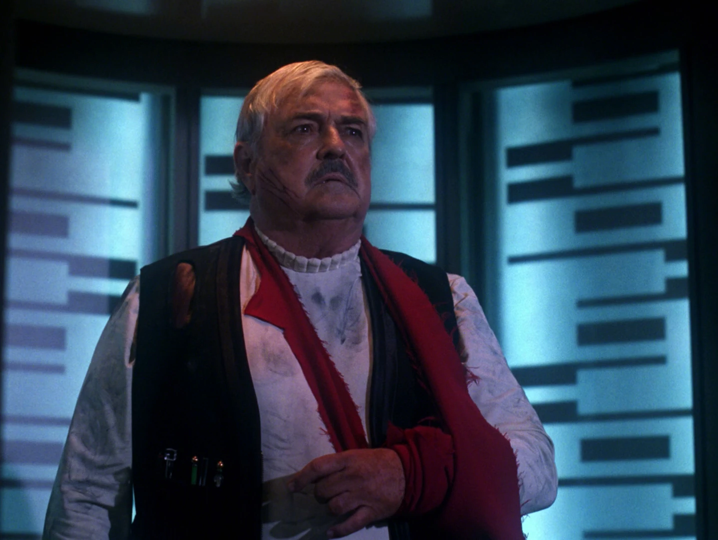 In 2294, Montgomery Scott made a makeshift sling for himself after injuring his left arm in an accident on the USS Jenolan. He re-materialized, still wearing it, in 2369. (TNG: "Relics")