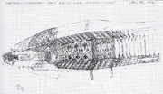 The movie Insurrection, was the first feature film where it was conceived that all the visual effects would be executed as computer-generated imagery (CGI). At that point in time, the technique was still relatively new, and the workload entailed in creating these effects was such that it was decided to employ two effects houses for their creation; Blue Sky/VIFX, was contracted to provide all planet bound effects, whereas Santa Barbara Studios (SBS) would be responsible for all the space-bound visuals. Since the first visual in the feature of the vessel was an exterior one in outer space, the construction of the Son'a collector exterior therefore fell to SBS. SBS' Effects Supervisor John Grower stated, "John sent us elevation views and one or two ¾ perspective drawings of each ship, but we had to do a lot of deduction work. The Son'a Flagship and Battleships had very complex shapes and all of these incredible compound curves, which didn't appear in the plan views." As to underscore Grower's comment, Eaves produced an extra drawing as visual aid, apart from Jein's study model, for the modelers at SBS of the collector model to mull over, showing the collar assembly detached from the main body. Continuing, Grower added, "They're thin in one dimension and very wide and long in the other, kind of like a trilobite. The biggest challenge was that the Son'a ships didn't look the same from one angle to the next, so if we rotated around them a little bit, their profile changed because they had hundreds of compound curves that hooked together to form their shape. Getting it all to flow involved a ton of work and a very long modeling process." Apart from the intricate designs, creating digital ships on the computer was a labor, and time consuming effort from a technological standpoint as well, given the state of CGI technology at the time, as Grower further recalled, "Each ship was made up of lots of nurb surfaces, and the databases were hundreds of megabytes per ship. These models were very heavy, but Maya [remark: the CGI software package of choice at SBS] allowed us to efficiently structure and organize the data. We went through several iterations [of the ship designs] before we got approval, and Maya helped a lot there as well. Once we got the ships approved, of course, we had to make them look real." (American Cinematographer, January 1999, pp. 41-42)
