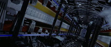 Nevertheless, an interior was already envisioned in an earlier treatise of the script. As Blue Sky's Jim Key recalled, "Initially Carlyle had been given a cutaway sketch of the ship's interior that John Eaves had done a month before. It explained how the sails connected to the inside, as well as the main compartments. The only objection to it was the overall shape. Jim Rygiel and John Kilkenny wanted more of a true cylindrical shape to establish correct receding perspective. They also wanted scale items and mechanisms to enact movement on the sails when they were being deployed or gathered." Continuing, Key added, "During our opening discussions, Carlyle and I decided to make the interior a series of repeating truss sections, with gaps between each major area to open up the whole of the interior tube. This approach ensured a practical way of constructing the miniature and helped provide a clear internal vista to the camera, whether it be locked off or moving through the set. Our only other features were to install turning shafts that would crank down or raise the sails during the release or gather sequences, We even thought about the Collector, which would have resembled a huge tube with windings placed all around it, much like a generator with the armature removed." With everything in place, Key, in April 1998, set about to design the interior of the Son'a science vessel, "(...) the entire interior reminded one of looking down the inside of a dirigible, large enough to stow the Enterprise. With all of these drawings completed and layered together so that we could make a 'reveal' presentation, they were handed off to Peter Lauritson and rick Berman for evaluation. The response was positive – however, the price tag wasn't. Glorious as it was, it was simply out of the budget. Relegated to joining the CG roster, the interior would ultimately become a digitally created backdrop, handled in part by modeler Robert Rioux. Respectfully, we had signed off on it, thinking that was the last of the design work." (Sci-Fi & Fantasy Models International, issue 35, pp. 18-19)