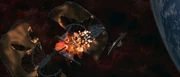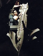 Though later referenced to in the Deep Space Nine television series and Star Trek Nemesis, the Son'a were never again featured visually, nor were any of their ships, so none of the CGI Son'a starship models were ever upgraded in the LightWave 3D CGI software for later representation. The CGI model though, was used as menu backdrops for disc two of the Star Trek: Insurrection (Special Edition) DVD. There actually was a reason for the later non-appearances of the Son'a ships, as Star Trek: The Official Starships Collection project manager Ben Robinson has indicated in 2015 that the original model computer files were no longer in existence, due to Paramount Pictures's failure to maintain ownership over these, as well as due to Santa Barbara Studios' own demise, "Never found the CG models from Insurrection... so we're rebuilding them! Makes me feel like Dan Curry." [1], he explained, "I'm working on this [remark: Son'a ships for the Collection] at the moment. It's tricky because the company that made the CG - Santa Barbara Studios didn't archive them and used their own software. Nothing is impossible though and I do have perfect reference [remark: referring to renders he had received for the Star Trek Fact Files years earlier]." [2] Still, Robinson considered the Insurrection designs too signature for them to be left out of his collection, and planned for their inclusion based on newly reconstructed CGI models, starting with two Starfleet ships featured in that film. [3]