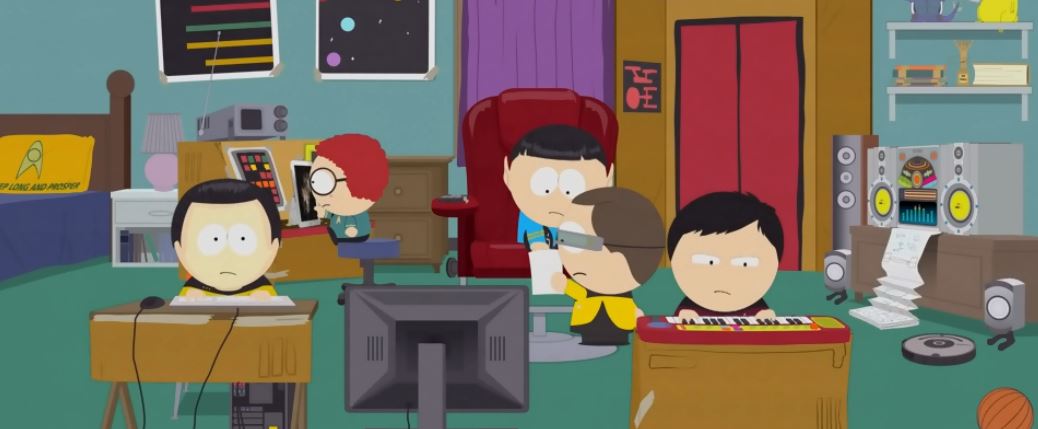 [S17, E07] In an attempt to recruit more kids into buying the Xbox One video game console on Black Friday with his Game of Thrones group, Cartman contacts a group of kids playing "Star Trek", who are shown in a "bridge" in one of the kid's bedroom through FaceTime on a computer monitor set up like a viewscreen. During the conversation, he mocks them and gives the Vulcan salute and say, "Uh yeah, big dong and prosper." instead of "Live long and prosper."