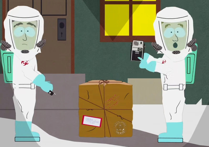 [S5, E09] When Stan receives a package from Afghan children, his parents report this to the police believing it to be a bomb. After this, bomb experts equipped with Starfleet tricorders are sent in to investigate the package to find any bombs only to discover that inside the box was a goat.