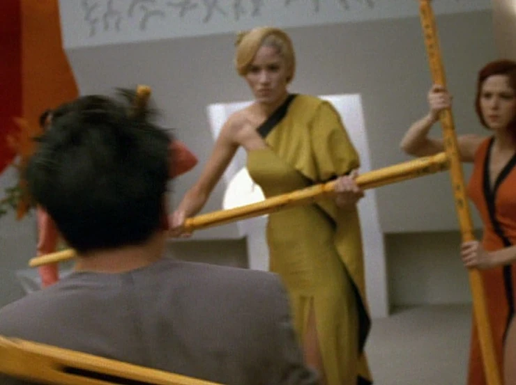 Taresian females used yellow staves with black writing during their joining ceremonies. Usually, they were just beaten together a few times, but if the male resisted, their true nature became clear: they were used as hand weapons. (VOY: "Favorite Son")