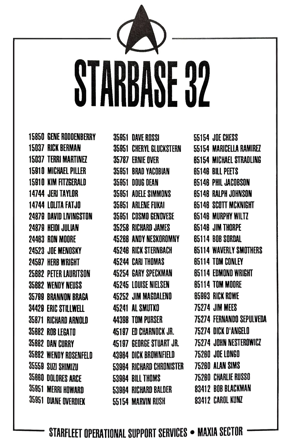 Starbase 32 was not explicitly named in the episode or script for "Violations" but comes from a placard seen on the wall behind Picard during the flashback sequence. This was created by the show's art department and features the names of various Star Trek production staff. The bottom of the plaque reads "Starfleet Operations Support Services" suggesting Starbase 32 was assigned to this department. (Star Trek: The Next Generation - The Continuing Mission, p.157)