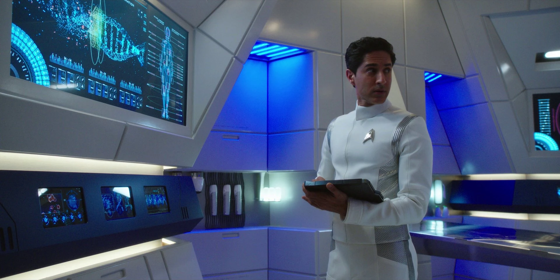 Medical staff aboard starships wore an all-white version of the standard duty uniform, featuring silver sciences-division trim and Starfleet insignia. This uniform was worn with gray boots. (DIS: "The Vulcan Hello", "The Butcher's Knife Cares Not for the Lamb's Cry")