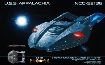 According to the Star Trek Encyclopedia, 4th ed., vol. 2, p. 519, the USS Hiroshima (β) was a Steamrunner-class vessel. This ship name was referenced in the 2nd edition from behind-the-scenes sources ILM, John Eaves, and Alex Jaeger and was absent from the 3rd edition. The original ship scale with alternate names can be found on John Eaves' blog. Originally, the Appalachia was not among the three class member suggestions Eaves provided his producers, in which only were USS Cavor (NCC-52133), USS Hiroshima (NCC-52136, usurped by Appalachia), and USS Menehune (NCC-52142).