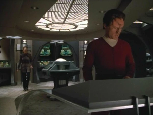 Showing Steth's ship destabilizing in the teaser involved coloring the energy outline in shades that were unusual for the craft. "I tried to show that [with] color [....] When Steth was having trouble we had a lot of reds and oranges start running through this shell which was normally blue and green," Ron Moore explained. "I've found that in the [compositing] bay, I have some control, and do the final tweaking there. That's what we did with the color." (Cinefantastique, Vol. 30, No. 9/10, p. 103)