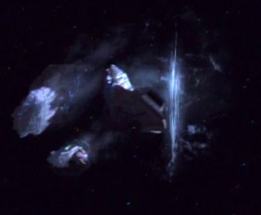 A shuttlepod departs the wormhole, as three comet fragments leave a silithium trail inside