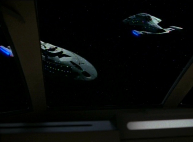 While returning to Voyager, they encountered a temporal reflection of the ship, making it appear as if there were two Voyagers. Deducing that the ship that was stationary was the real one, due to the fact that they were holding position in anticipation of the shuttle's return, Janeway and Torres were able to dock with Voyager, and the ship was able to escape. (VOY: "Parallax")