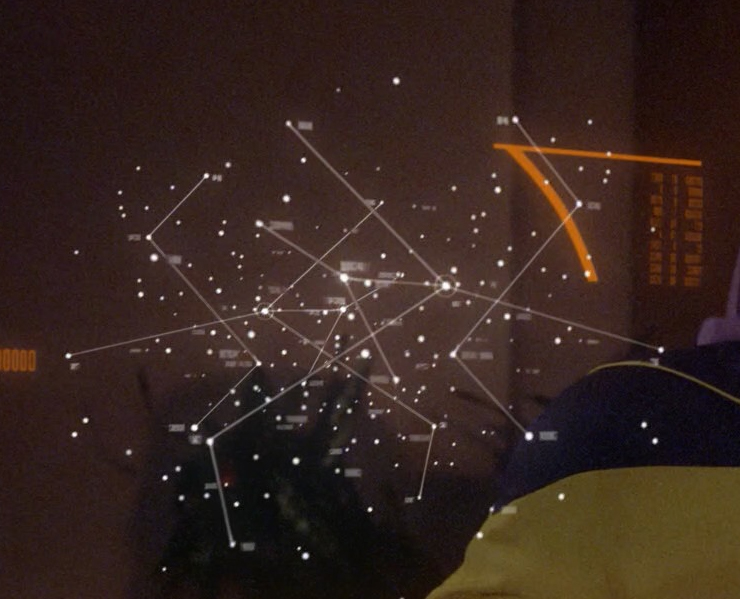 The Enterprise senior officers convene again in the observation lounge. There, Data explains what is known about the mysterious planet, but not before becoming stuck with a Chinese finger puzzle left in the room by a couple of children, Matthew and Pola. Thanks to the help of Picard, Data gets his fingers released and explains that the planet might be one of the most distant outposts of the Tkon Empire, an ancient and powerful space federation that existed over six hundred thousand years in the past and was now extinct due to their star going supernova. During the meeting, a probe launched from the Enterprise transmits its information, revealing that indeed both ships are trapped in a force field emanating from the planet's surface. Picard thinks that they should investigate with an away team sent to the surface and perhaps team up with the Ferengi. As Picard, Riker, Data, and La Forge leave the lounge, La Forge tosses the finger trap to Data, who catches it.