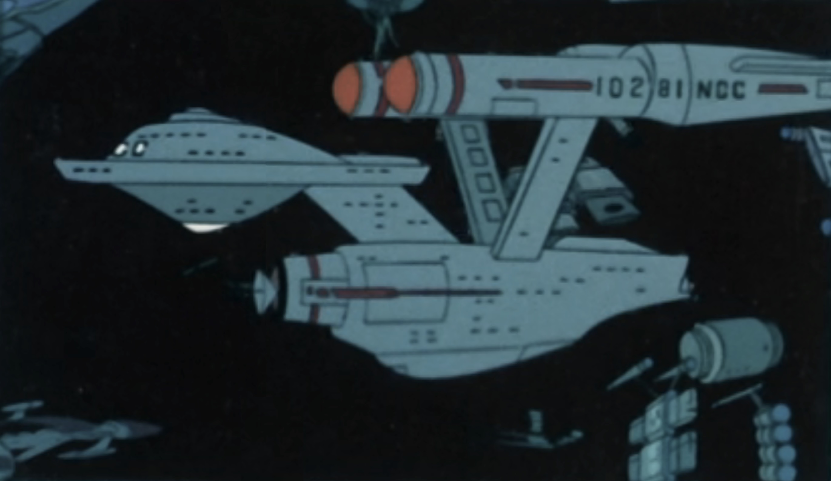 - Many of the vessels in this episode's graveyard of ships were unapproved early designs for the insectoid starship from TAS: "Beyond the Farthest Star". (Gene Roddenberry's Star Trek: The Original Cast Adventures, p. 156)