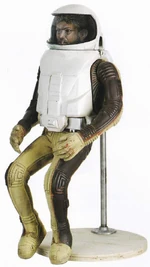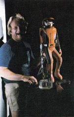 "Another thing we did for the Epsilon 9 sequence was build a two-foot tall scale model spaceman that we had zipping around this way and that. Doug used it also in the drydock sequence and in the Spock spacewalk. David Sosalla did the sculpting, including the faces of Spock and the others who would be inside the suit; and John Ramsay worked out the mechanics for articulating the arms and legs. It was shot using motion control, and then we went back in with animation and added little blips of energy from the thrusters. "There were a couple nice shots that didn't get into the film, where the puppets are being chased by the destruction in a different way than we've got them appearing now. But we ran out of time, and weren't able to get them to go together right." (Cinefex, issue 2, pp. 58-59)