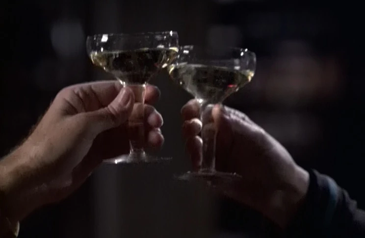 Deanna Troi and Zefram Cochrane share a toast