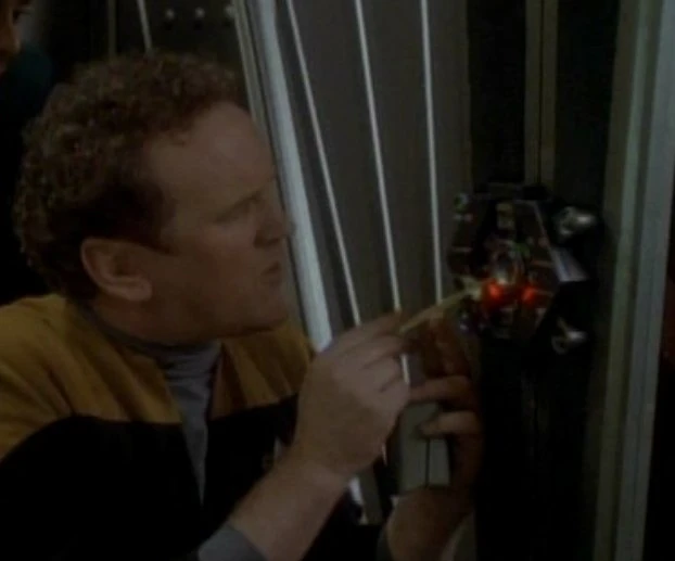 Rom concocted one of his "special security locks" using this type of mechanism in 2371 to guard Quark's while he and Quark visited Ferenginar. Unfortunately, Chief O'Brien and Doctor Bashir's dart board was locked inside, and they attempted to dismantle the lock rather than replicate a new board – though they both denied their old one was lucky. Of the lock, Odo observed, "I've never seen anything so convoluted." (DS9: "Family Business")