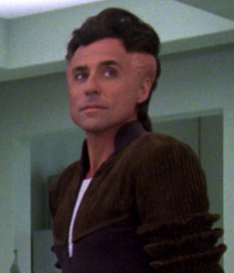This male was a member of a delegation on the Enterprise-D in 2370 that was being taught verbal communication by Lwaxana Troi. He, like other Cairn, used telepathic means as his form of communication. He was also present in the arboretum when Lwaxana Troi became unconscious. (TNG: "Dark Page")