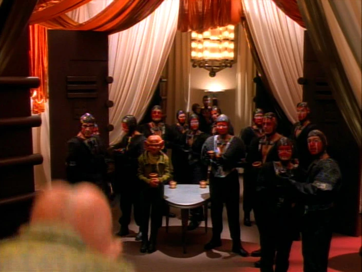A group of Dosi in a hall of business, who were drinking tulaberry wine from an elaborate fountain, were startled when Quark overturned the fountain to get their attention. (DS9: "Rules of Acquisition")
