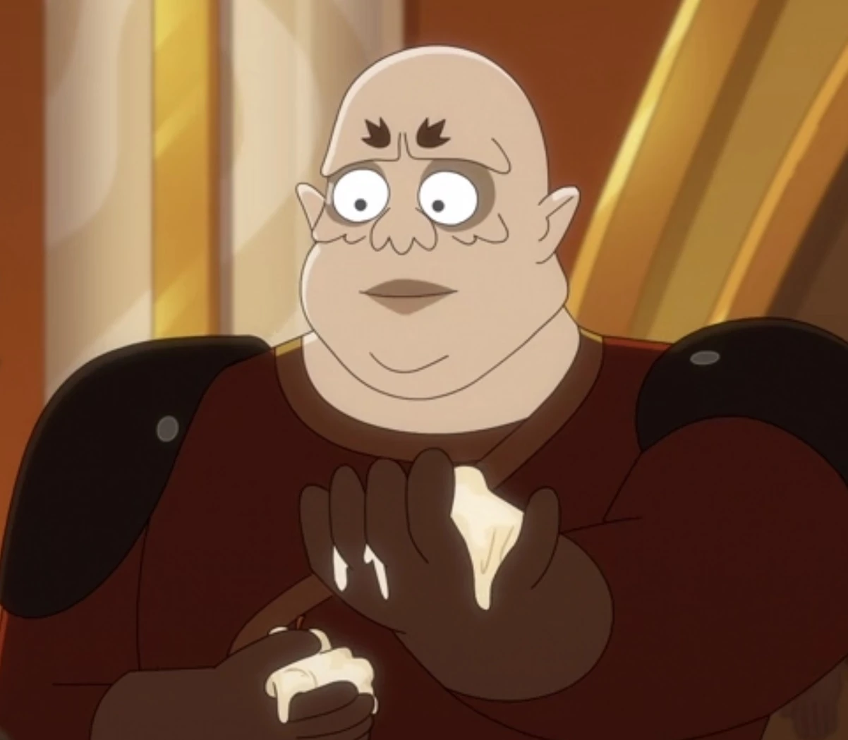 This delegate, who was present during the "rebelution", pointed and announced, when the new Pakled leader put on the disposed Emperor's helmet, "He is strong!" (LD: "The Spy Humongous")