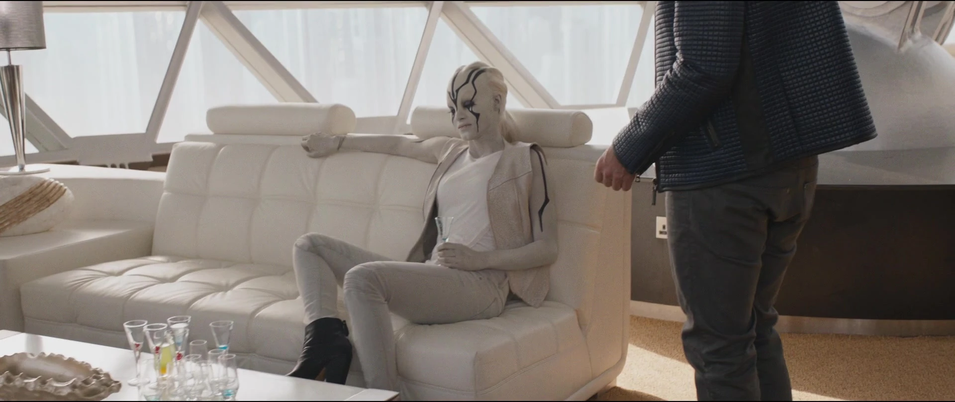 Jaylah was told by somebody that various drinks would take the edge off, so she tried them, but as she explained to Montgomery Scott, "my edge is still not off." Scott was impressed by her beverage consumption. (Star Trek Beyond)