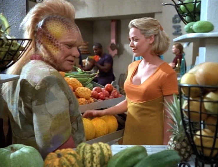 The marketplace on a planet in the Delta Quadrant offered fruits, roots and apple-like ones, and bread-like types of food. One of the fruits was placed on Caylem's head by Augris and a bread-like food was placed in his mouth after he entertained the Mokra Order soldiers. (VOY: "Resistance")